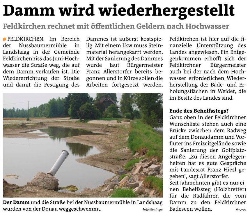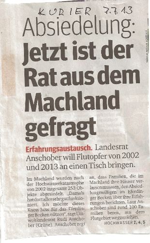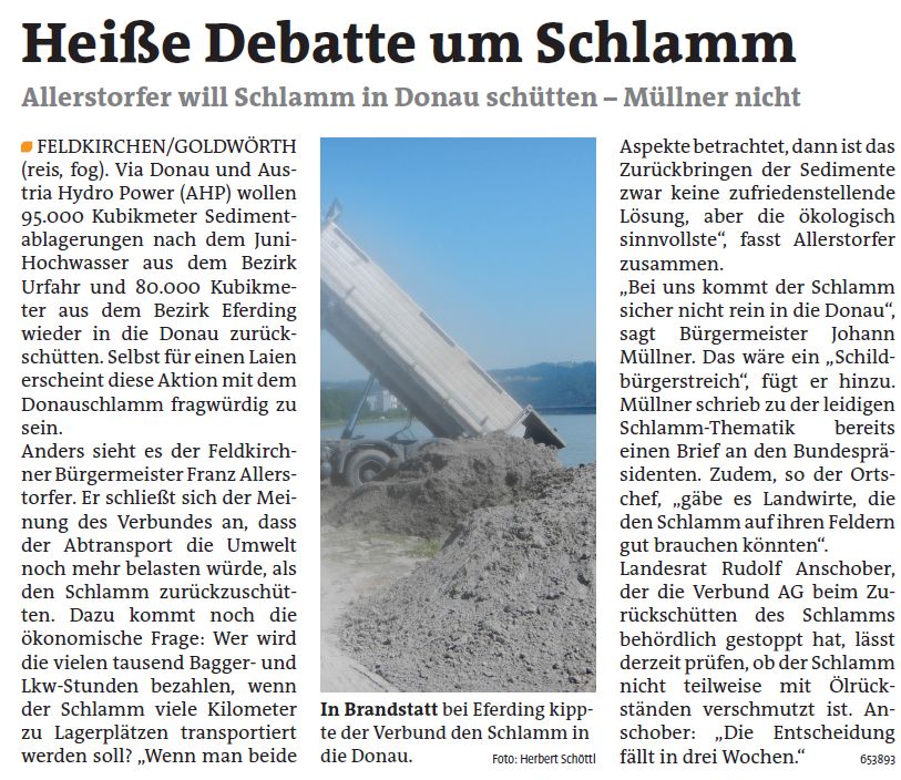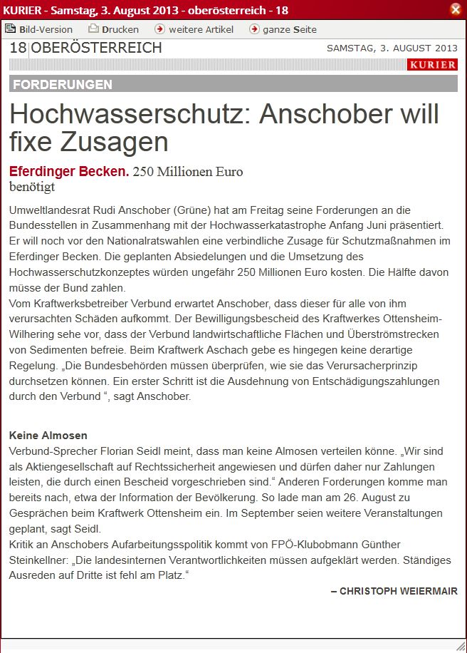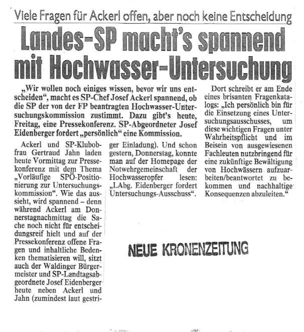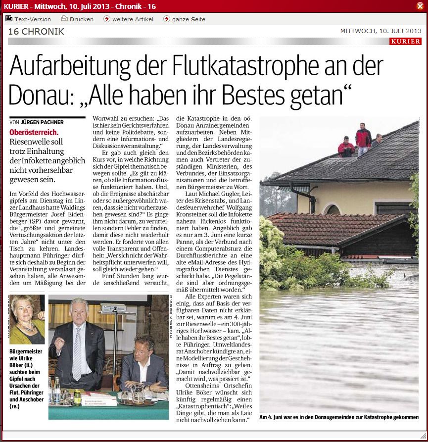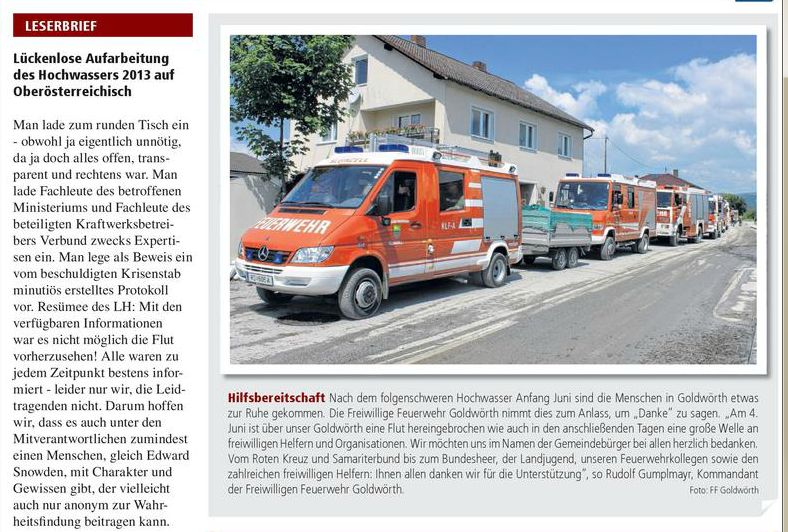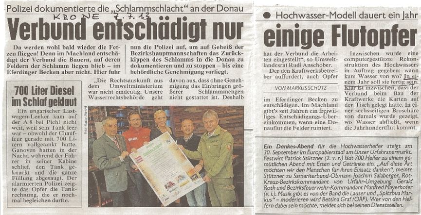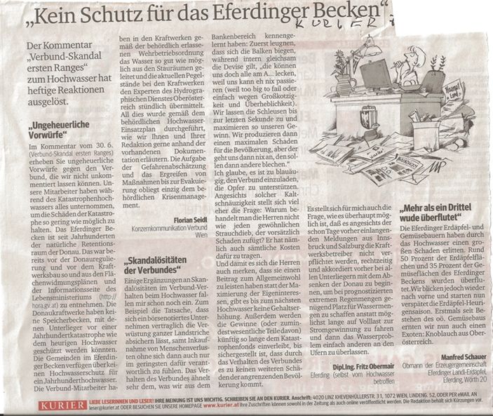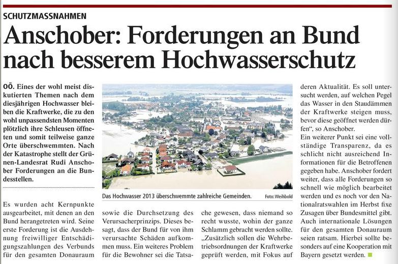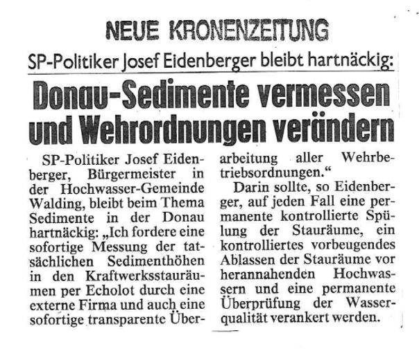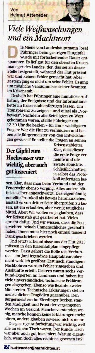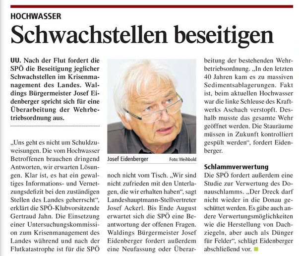 http://www.hochwasser2013.at/index.php/archiv/medien#sigFreeId63a633c6fe Eidenberger kontert, dass der Minister seine wertvolle Zeit besser dafür verwenden solle, um die längst nicht mehr zeitgemäße Wehrordnung transparent mit dem Land und den betroffenen Gemeinden neu zu formulieren, darin eine Verpflichtung für ein rechtzeitiges Warnen der Bevölkerung vorzusehen, damit man nicht mehr nächtens – ohne Vorwarnung! - ganz feige geflutet werden könne, bzw. endlich die seit 14 Tagen eingeforderten Pegelstände/Durchflussmengen während des Hochwassers herauszurücken. Der Minister hätte genug zu tun, um endlich die Stauräume, die zum Teil mehrere Meter hoch verschlammt sind, ausbaggern zu lassen bzw. für ein rechtzeitiges kontrolliertes prophylaktisches Ablassen der Stauräume vor herannahenden Hochwässern zu sorgen. LAbg. Bgm. Josef Eidenberger, Walding |