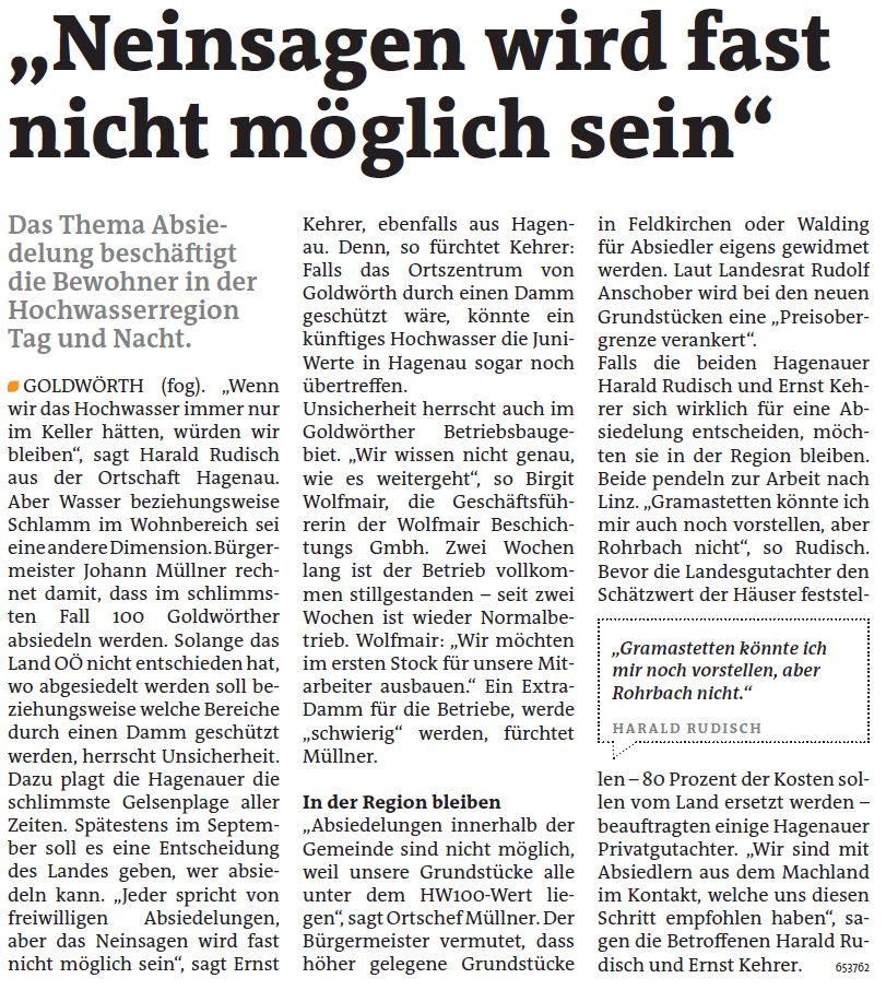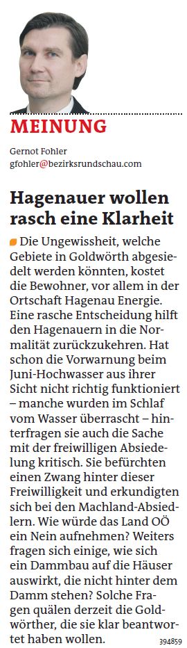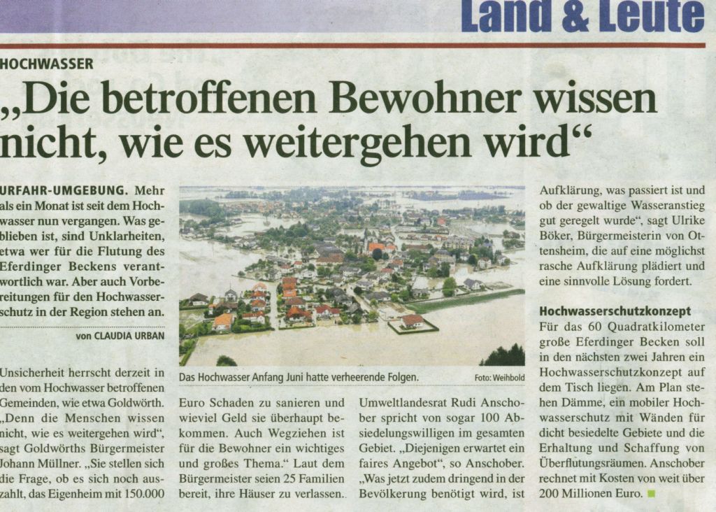 1) Absiedlungen sind eine Geldfrage „Wir wissen nicht ob, wir uns das Wegziehen überhaupt leisten können“, sagt eine Betroffene. 2) Hochwasser soll in einem Jahr „entschlüsselt“ sein Wie konnte das Wasser im Eferdinger Becken in der Nacht zum 4. Juni sprunghaft ansteigen? Welche Rolle spielte der Kraftwerksbetreiber Verbund? Gehören die Alarmpläne und Wehrbetriebsordnungen überarbeitet? 3)