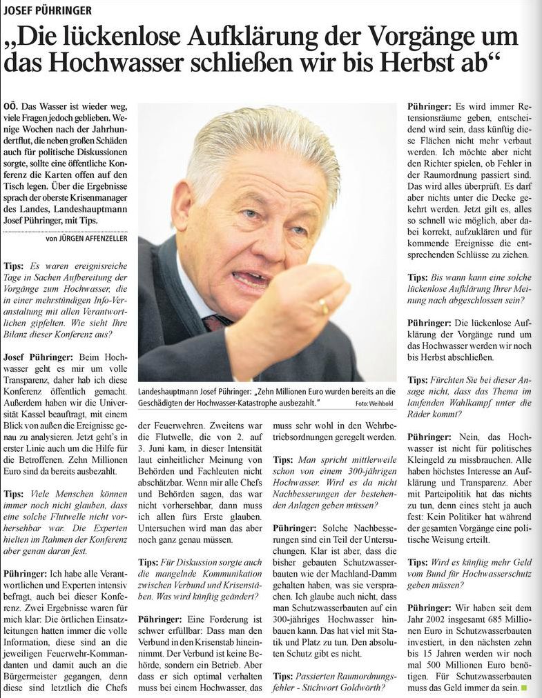 http://www.hochwasser2013.at/index.php/archiv/medien#sigFreeIdf36f80f420 Pühringer: "Die lückenlose Aufklärung der Vorgänge um das Hochwasser schließen wir bis Herbst ab!"