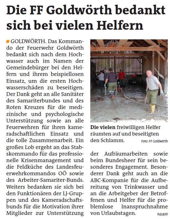 FF Goldwörth sagt Danke GOLDWöRTH. Den vielen freiwilligen Helfern während der Flut. ![]() |