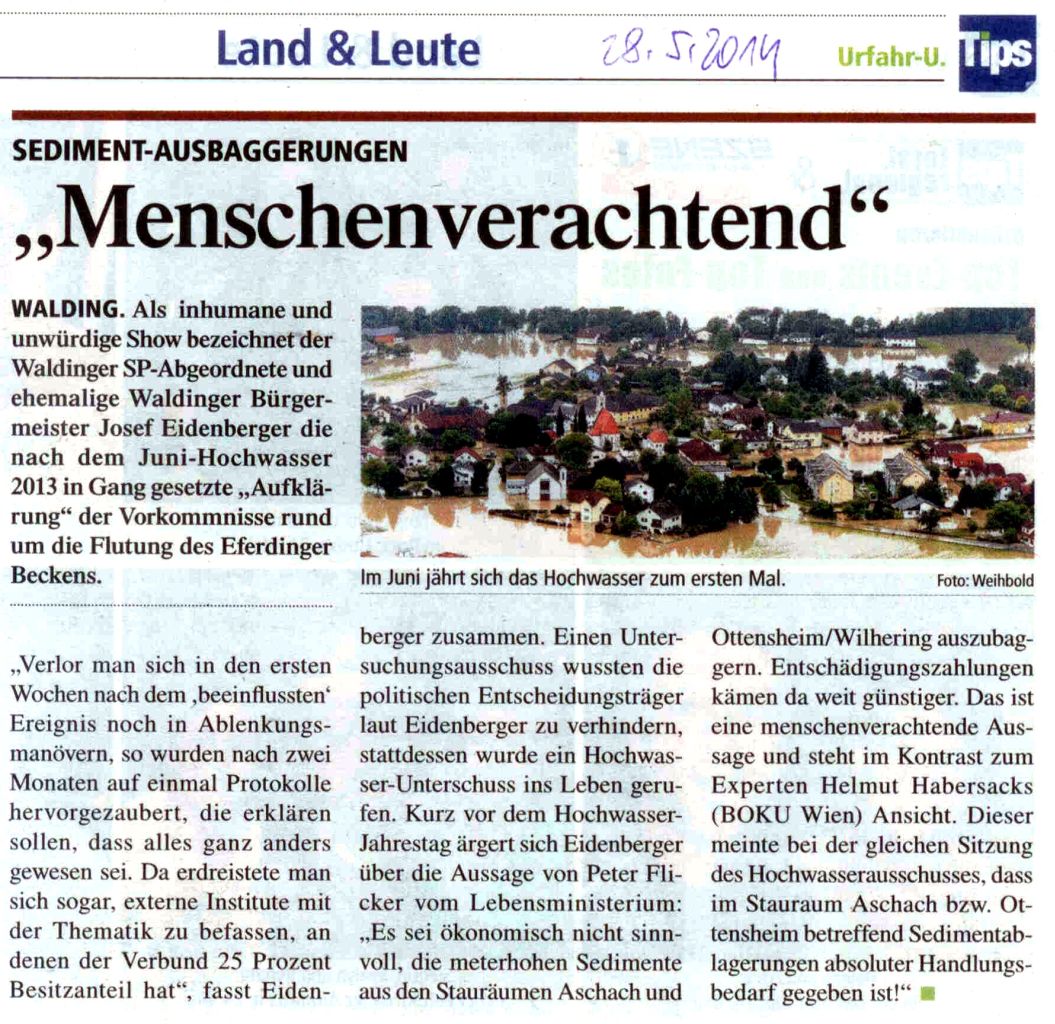 Als inhumane und unwürdige Show bezeichnet der Waldinger SP-Abgeordnete und ehemalige Waldinger Bürgermeister Josef Eidenberger die nach dem Juni-Hochwasser 2013 in Gang gesetzte „Aufklärung“ der Vorkommnisse rund um die „bewusste“ (inzwischen zugegebene) Flutung des Eferdinger Beckens und geht damit mit den Verantwortlichen dieser Schmierenkomödie hart ins Gericht.