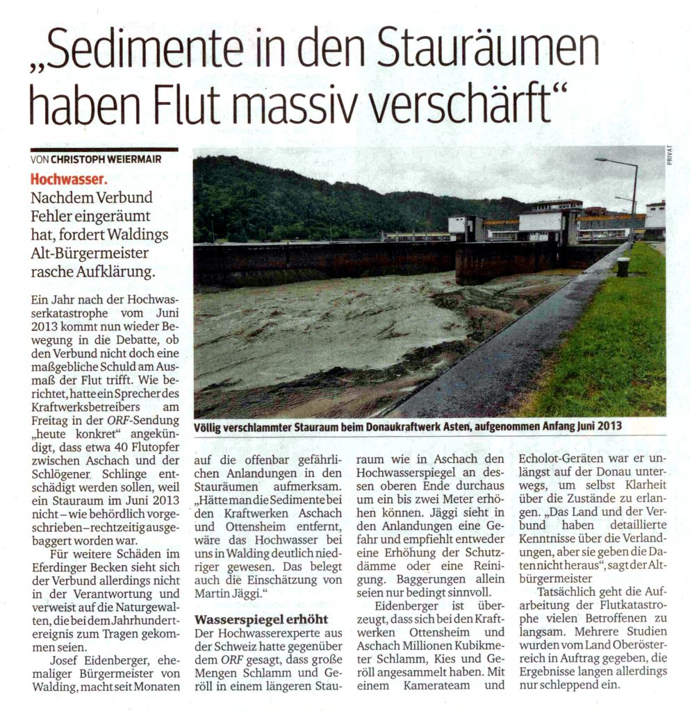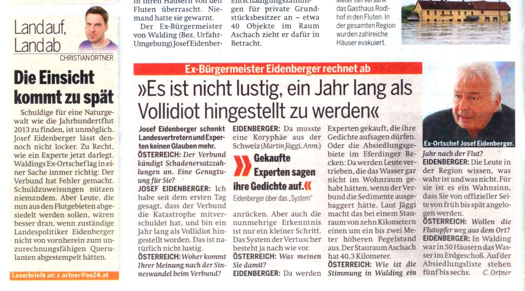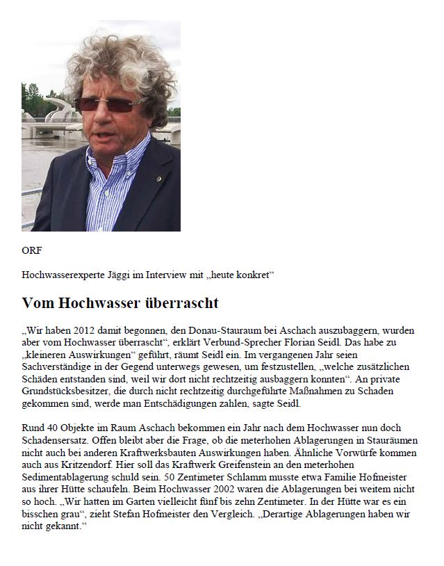 Als weitere Bestätigung seiner seit Juni 2013 immer wieder vehement in den Raum gestellten Behauptung, wonach das „beeinflusste Hochwasser“ im Eferdinger Becken aufgrund vieler Fakten, die einfach nicht ausgesprochen werden dürfen, so extrem ausuferte, sieht der ehem. Waldinger Bürgermeister und Abgeordnete Josef Eidenberger die in der ORF-Sendung „Konkret heute“ von Freitag, 30. Mai ausgestrahlte Feststellung des Schweizers Dr. Ing. Martin Jäggi, eines international ausgewiesenen Fachmanns auf dem Sektor Flussbau und Fluss-Morphologie.