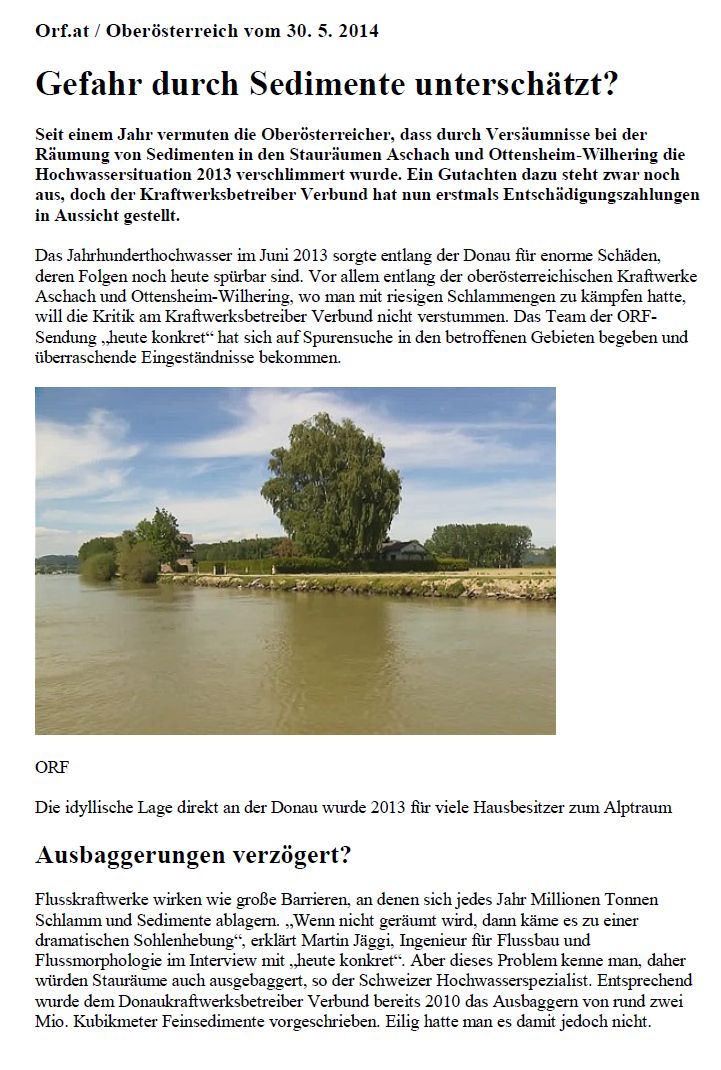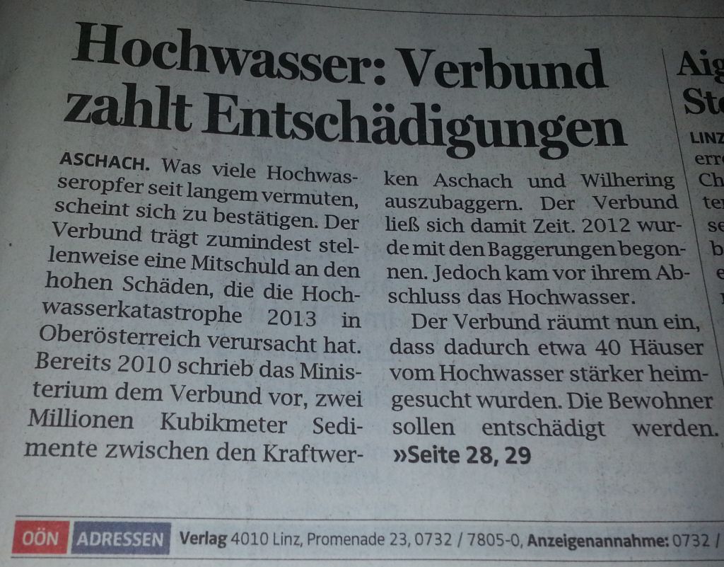 Zwei Wochen vor dem Jahrestag des Hochwassers 2013 kam nun die entlarvende, menschenverachtende Aussage von DI Flicker (Lebensministerium), wonach es „ökonomisch nicht sinnvoll sei, die (meterhohen) Sedimente aus den Stauräumen Aschach und Ottensheim/Wilhering auszubaggern: Entschädigungszahlungen (nach Hochwässern) kämen da weit günstiger …“
