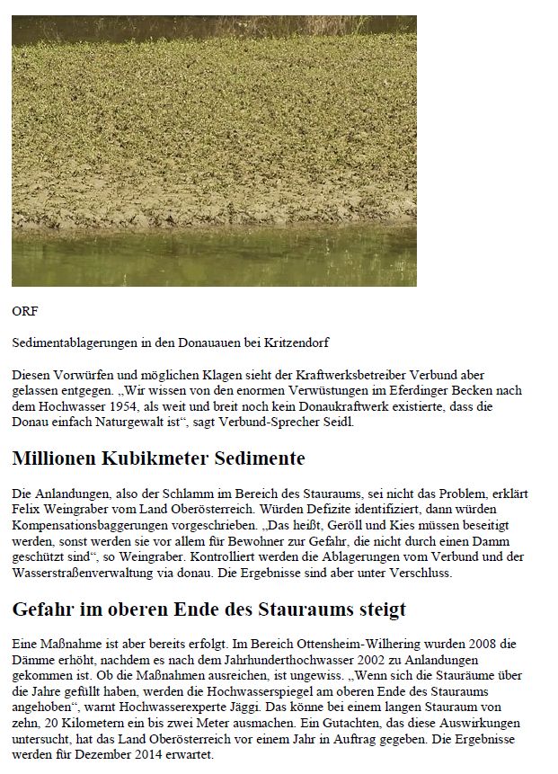 Nun hat der Stauraum von Ottensheim 11 km Länge, der von Aschach sogar 40,3 km! Aufgrund der bis zu 10 m hohen Sedimentstöcke in den Stauräumen behauptet Eidenberger in Konsequenz von Dr.Ing. Jäggi´s Aussage, dass das Junihochwasser 2013 ganz entscheidend niedriger hätte sein müssen/können , wenn es seitens des VERBUNDS immer (ein eigentlich im Kraftwerks-Genehmigungsbescheid von 1969 VORGESCHRIEBENES!) Sediment-Management praktiziert hätte.